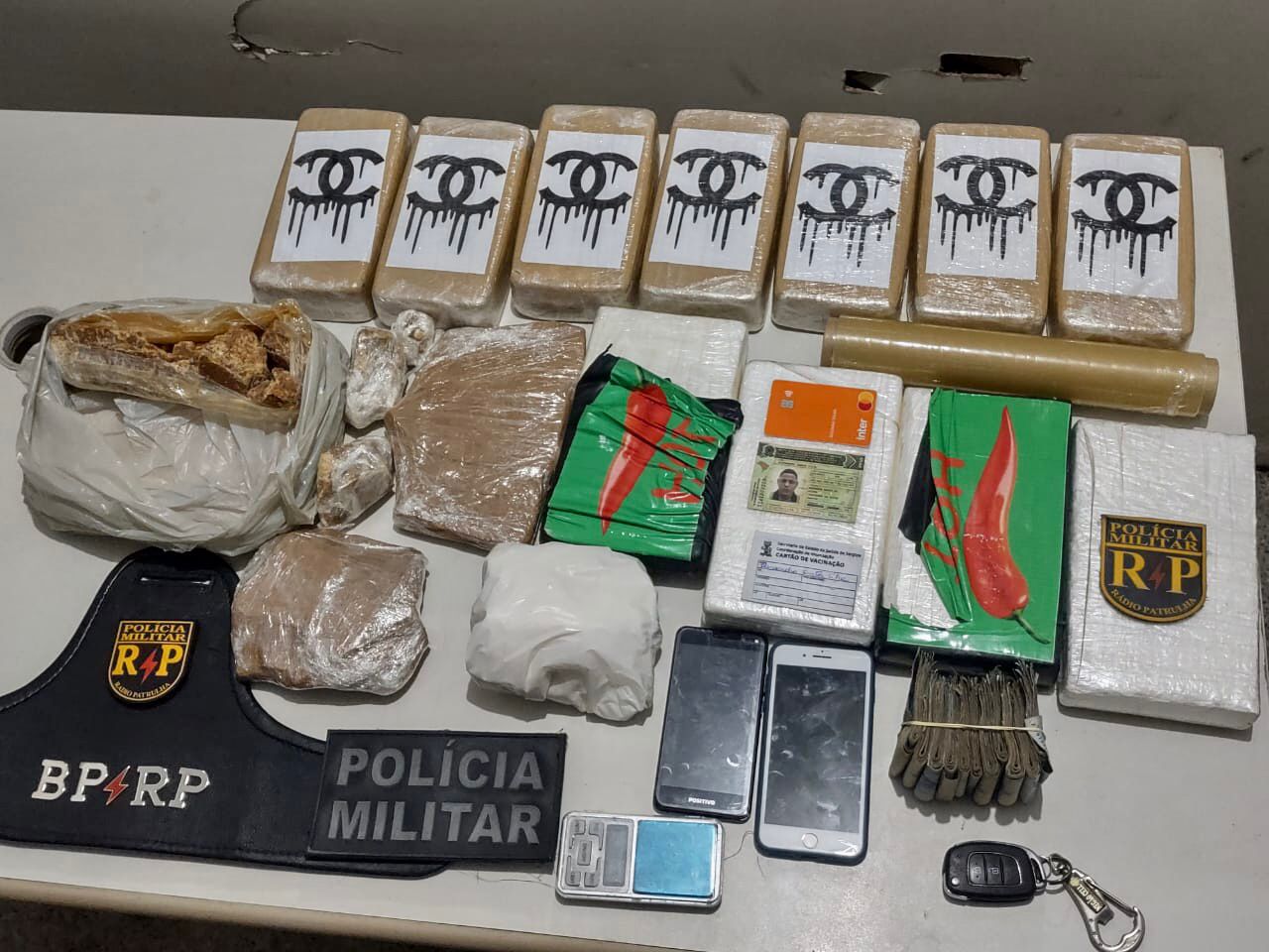 Diante do flagrante uma busca foi feita no local e foram apreendidos, aproximadamente, 10, 5 quilos de crack e 5 quilos de cocaína, além de uma balança de precisão, um veículo HB20, que fez o transporte do material entorpecente, e a quantia de R$ 556,00 (quinhentos e cinquenta e seis reais ).