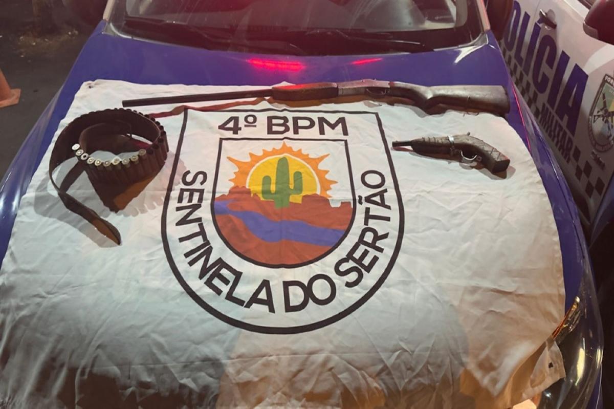 Os militares realizavam o Estágio Operacional Raio, quando foram acionados para uma ocorrência de violência doméstica no Bairro Portelinha. No local, uma mulher negou o ocorrido, porém os policiais viram uma espingarda na sala. Outra arma e munições também foram apreendidas na residência. Um homem foragido estava na casa e foi preso.