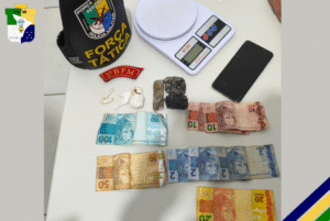 Com ele, foram apreendidos quatro trouxas com 10g de cocaína, duas pedras de crack e três trouxas com 31g de maconha. Além de R$196 em espécie e um aparelho celular.