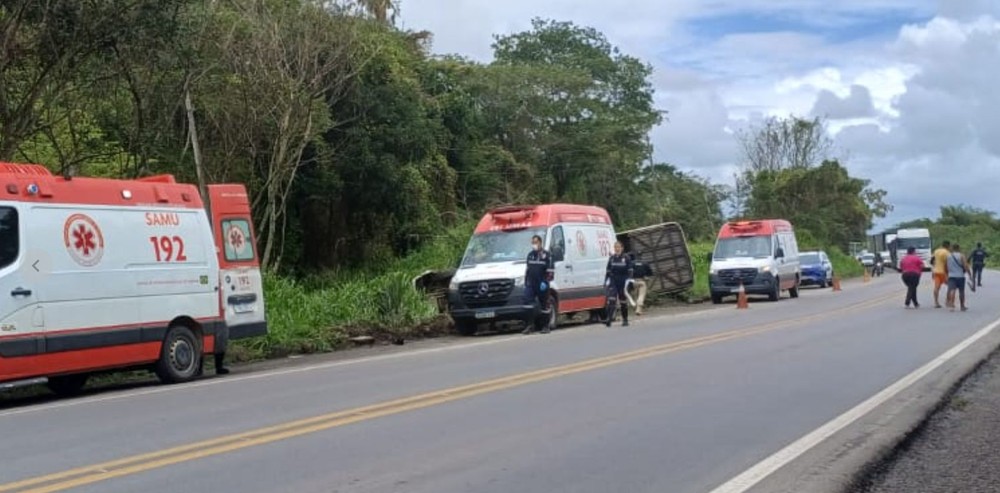 Cinco pessoas ficam feridas após micro-ônibus tombar na BR-101 em Sergipe