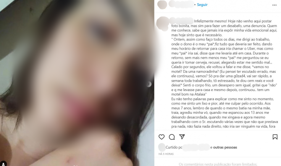 Uma mulher utilizou seu perfil no instagram, nesta quinta-feira, 12, para denunciar o pai por agressões físicas e assédio sexual. No relato, a garota conta que trabalha no estabelecimento do pai e, ao final do expediente desta última quarta-feira, ao levá-la para casa, o genitor tentou desviar o caminho para um motel. A vítima transcreveu […]